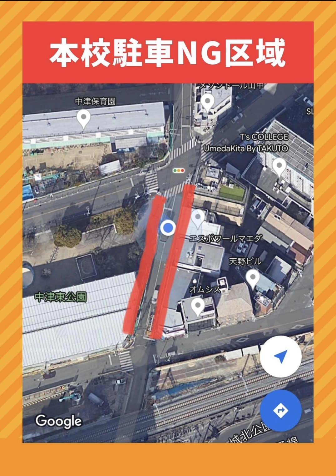 お子さんを降ろされる時は、スクール前の道路への駐車をご遠慮頂き、公園北側もしくは、少し離れたところでお願いします。