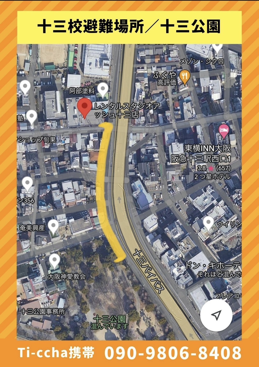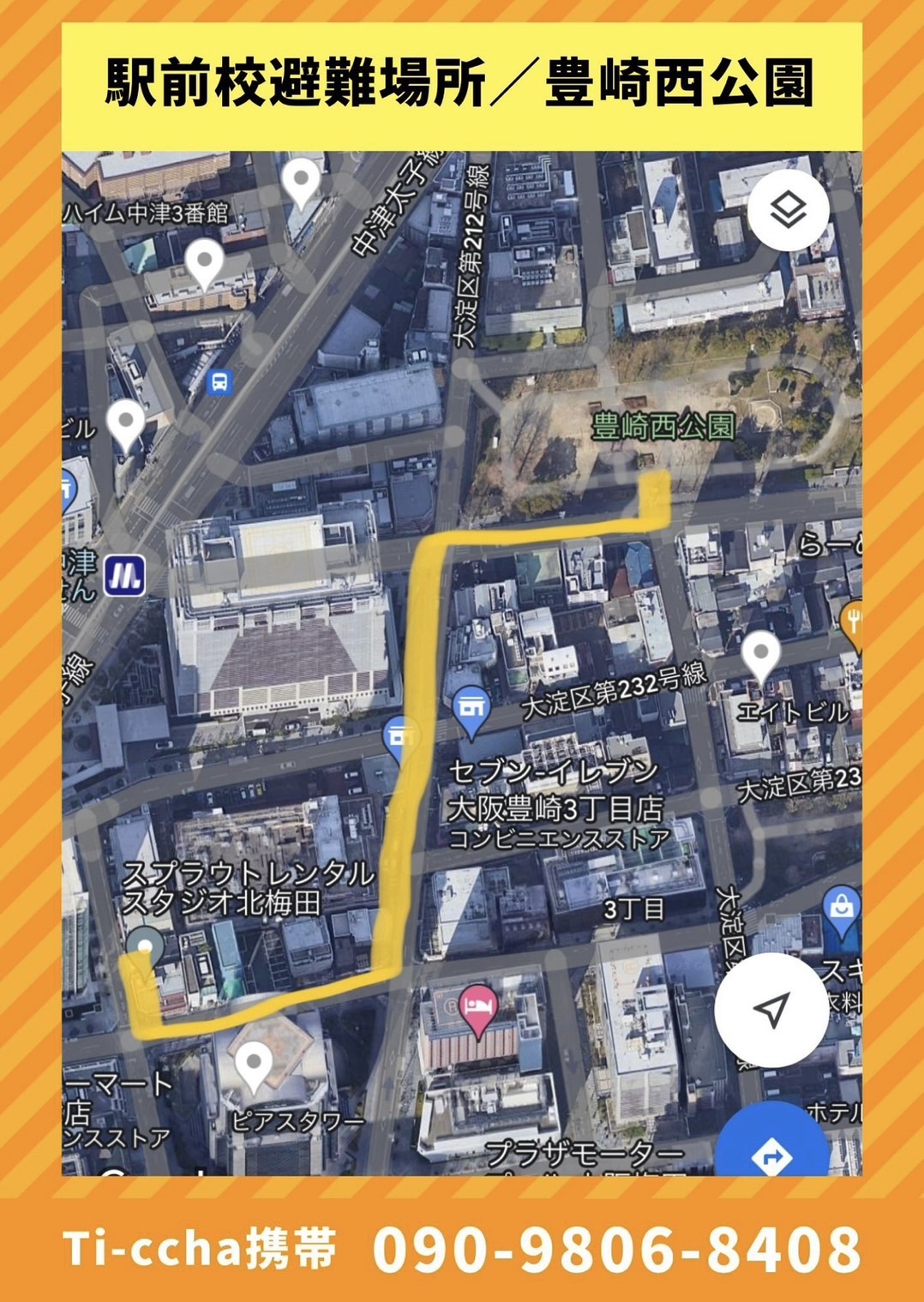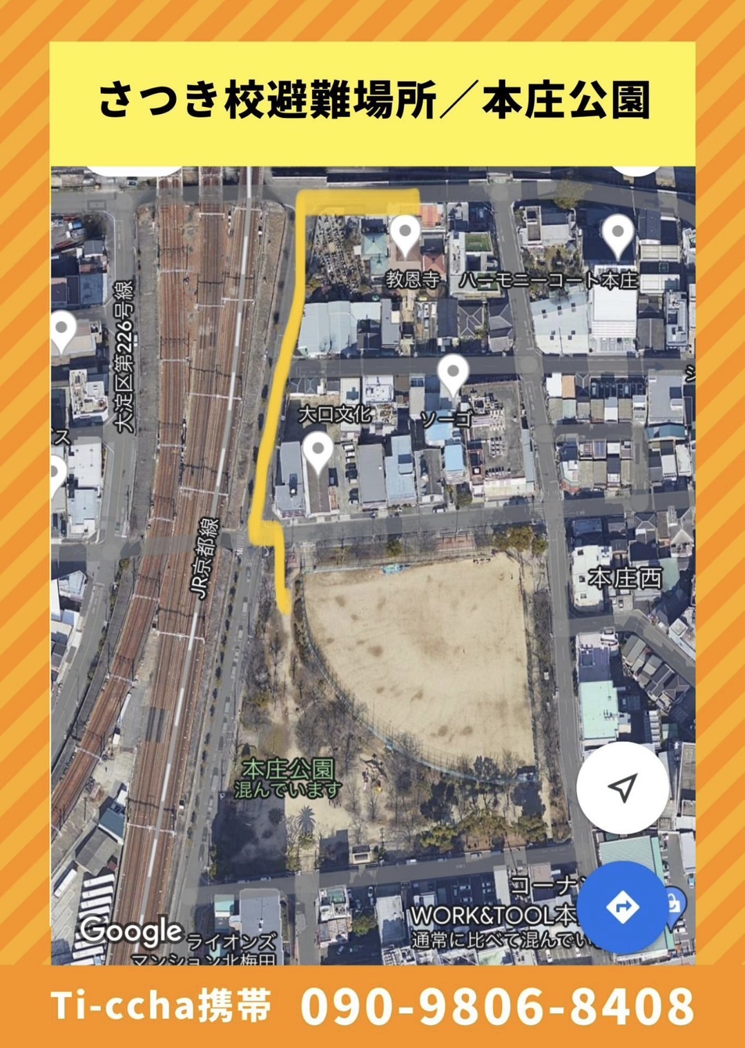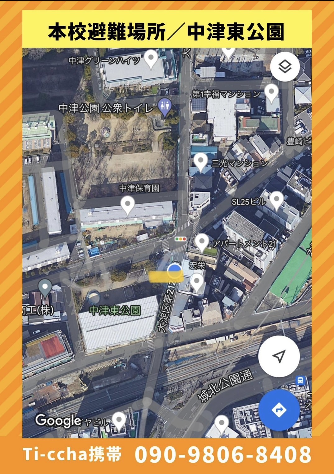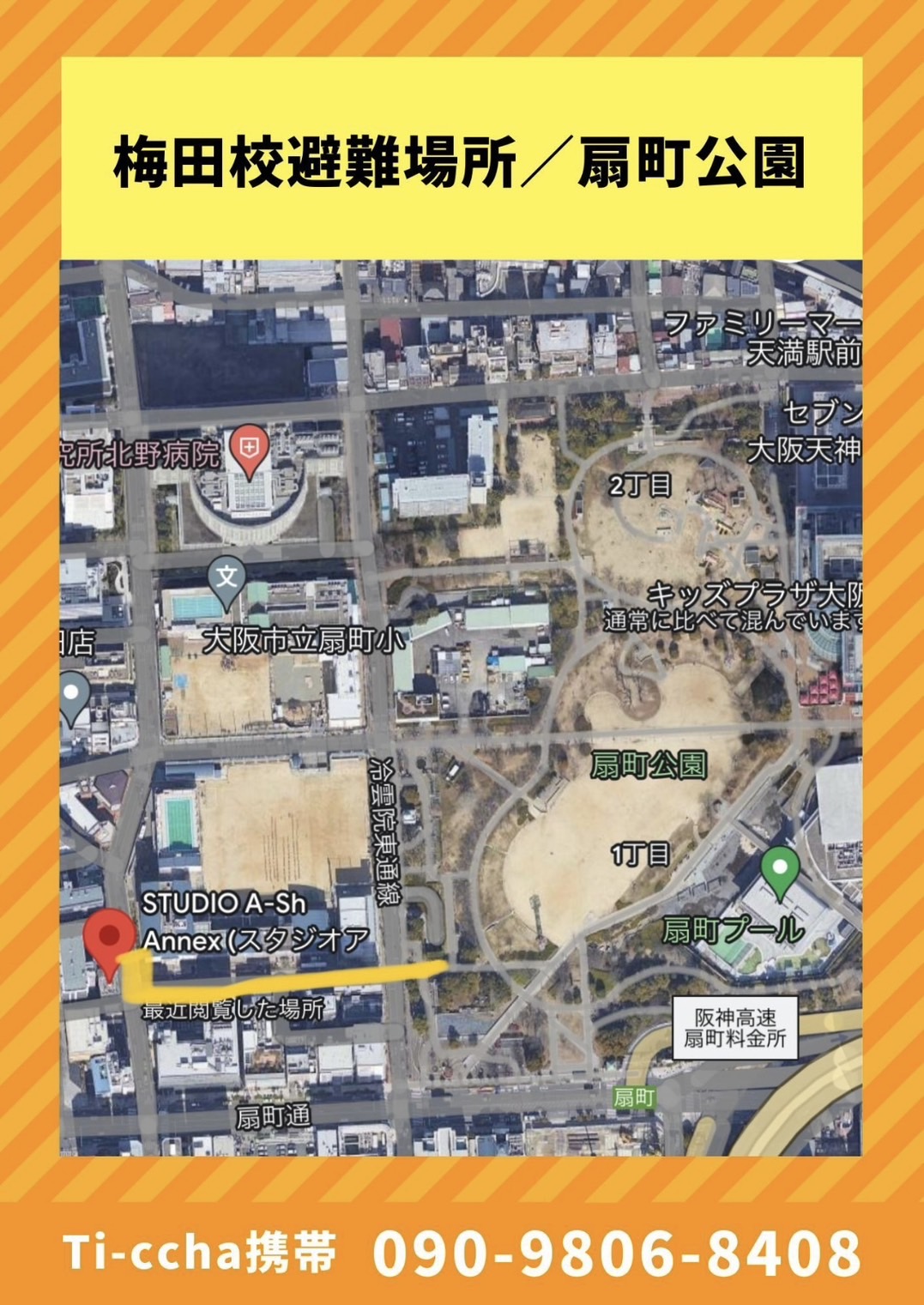 レッスン中、避難が必要になりました場合は、黄色のルートを通って、各校画像の場所へ避難致します。